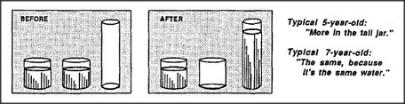 One might try to explain this by supposing that older children are better at counting. However, this can't explain another famous experiment of Piaget's, which began by showing three jars, two filled with water. All the children agreed that the two short, wide jars contained equal amounts of liquid. Then, before their eyes, he poured all the liquid from one of the short jars into the tall, thin one and asked which jar had more liquid now.