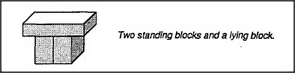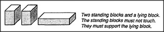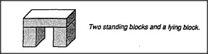 But if Block-Arch causes Hand-Change, then this can't be a block-arch. So the child must find some way to change the mental description of Block-Arch so it won't apply to this. What is the difference between them? Perhaps this is because those standing blocks now touch one another, when they didn't touch before. We could adapt to this by changing our description of Block-Arch: There must be two standing blocks and a lying block. The standing blocks must not touch. But even this does not suffice, because the child soon finds yet another structure that matches this description. Here, too, the Hand-Change phenomenon has disappeared; now you can push the car through it without letting go!