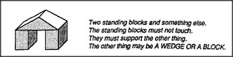 Block-Arch seems to cause a strange new phenomenon: when you push the car through it, your arm gets trapped! Then, in order to complete that action, you must release the car — and reach around to the other side of the arch, perhaps by changing hands. The child becomes interested in this Hand-Change phenomenon and wonders how Block-Arch causes it. Soon the child finds another structure that seems similar — except that Hand-Change disappears because you can't even push the car through it. Yet both structures fit the same description!
