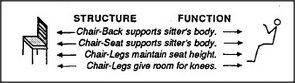 But that, too, seems inadequate: it makes it seem as though a chair were as insubstantial as a wish. The solution is that we need to combine at least two different kinds of descriptions. On one side, we need structural descriptions for recognizing chairs when we see them. On the other side we need functional descriptions in order to know what we can do with chairs. We can capture more of what we mean by interweaving both ideas. But it's not enough merely to propose a vague association, because in order for it to have some use, we need more intimate details about how those chair parts actually help a person to sit. To catch the proper meaning, we need connections between parts of the chair structure and the requirements of the human body that those parts are supposed to serve. Our network needs details like these: