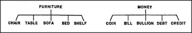 It certainly is hard to find any properties that all these share. Coins are hard and round and flat. Bills are thin and flexible. Bullion has unusual weight, and credits aren't even physical. We recognize them all as media of trade — but that won't help us recognize the things themselves. The situation is the same for furniture. It's not so hard to say what furniture is for — things that equip a room for living in. But when it comes to the objects themselves, it's even hard to find a uniframe for chair. Again, its function-role seems clear — a thing one can sit upon. The problem is that one can sit on almost anything — a bench, a floor, a tabletop, a horse, a stack of bricks, a rock. Even defining Arch has problems, since many things we recognize as arches just don't match our Block-Arch uniframe: