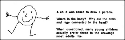 We normally assume that children see the same as we do and only lack our tricky muscle skills. But that doesn't explain why so many children produce this particular kind of drawing, nor why they seem so satisfied with them. In any case, this phenomenon makes it seem very unlikely that a child has a realistic, picturelike image in mind.
