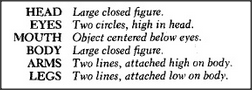 When the child starts to draw, the first item on the list is large closed figure. Since there isn't any such thing yet, the child draws one: that's the head. Next the eyes and mouth get drawn. But then, when it comes to drawing the body feature, step 2 of the procedure finds that a large closed figure has already been drawn. Accordingly, nothing new is required, and the procedure simply advances to step 3. As a result, the child goes on to attach the arms and legs to the feature that has been assigned to both the body and the head.
