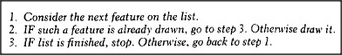 To convert this description into an actual drawing, the child must employ some sort of drawing procedure. Here's one in which the process simply works its way down the feature list, like a little computer program: