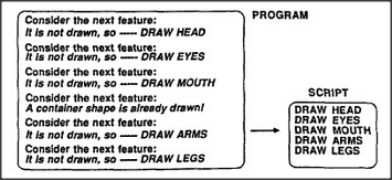 Perhaps, when we practice skills we can already perform, we engage a special kind of learning, in the course of which the original performance process is replaced or bridged-across by new and simpler processes. The program to the left below shows the many steps our novice portrait drawer had to take in order to draw each childish body-face. The script to the right shows only those steps that actually produce the lines of the drawing; this script has only half as many steps.