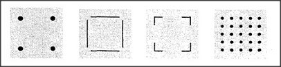 Some of these squares have no corners, others have no edges, and some of them have neither corners nor edges! What makes us see them all as squares? Psychologists have long wondered how we recognize such similarities but often forgot to ask how we recognize the very simplest forms of squares in the first place. Which comes first in recognition, specific features or global shapes? It must depend upon one's state of mind. The way we perceive the world, from one moment to another, depends only in part on what comes from our eyes: the rest of what we think we see comes from inside our brain; we respond not only to visual features, but also to our remembrances of things we've seen before and to our expectations of what we ought to see.
