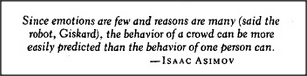 Since emotions are few and reasons are many (said the robot, Giskard), the behavior of a crowd can be more easily predicted than the behavior of one person can. —Isaac Asimov