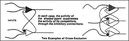 This would be no problem at a dinner table, where food and drink are both within easy reach. But under natural conditions, no animal could survive the waste of energy, when every minor fluctuation caused a major change in strategy. One way to manage this would be to use that marketplace infrequently — but that would make our animal less capable of dealing with emergencies. Another way is to use an arrangement called cross-exclusion, which appears in many portions of the brain. In such a system, each member of a group of agents is wired to send inhibitory signals to all the other agents of that group. This makes them competitors. When any agent of such a group is aroused, its signals tend to inhibit the others. This leads to an avalanche effect — as each competitor grows weaker, its ability to inhibit its challengers also weakens. The result is that even if the initial difference between competitors is small, the most active agent will quickly lock out all the others.