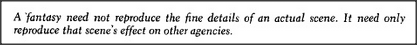 Fantasies usually depict occurrences we've never seen. They need no detailed, realistic images — since the higher levels of the mind don't really see things anyway! Instead, they deal with summaries of signals that come from sensory experience and are condensed at several levels along the way. In the fantasy of Professor Challenger, there was no need to see any of the actual features of Challenger himself; it was enough to reproduce some sense of how his presence once affected us.