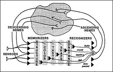 Something amazing happens when you go around a loop like this! Suppose you were to imagine three properties of an apple — for example, its substance, taste, and thin-peeled structure. Then, even if there were no apple on the scene — and even if you had not yet thought of the word apple — the recognition-agent on the left will be aroused enough to excite your apple polyneme. (This is because I used the number three for the required sum in the apple polyneme's recognizer instead of demanding that all five properties be present. ) That agent can then arouse the K-lines in other agencies, like those for color and shape — and thus evoke your memories of other apple properties! In other words, if you start with enough clues to arouse one of your apple-nemes, it will automatically arouse memories of the other properties and qualities of apples and create a more complete impression, simulus, or hallucination of the experience of seeing, feeling, and even of eating an apple. This way, a simple loop machine can reconstruct a larger whole from clues about only certain of its parts!