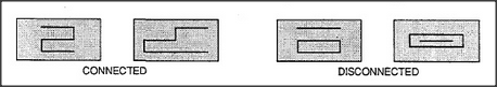 Both drawings on the left depict patterns that are connected — that is, that can be drawn with a single line. The patterns on the right are disconnected in the sense of needing two separate lines. Here is a way to prove that no feature-weighing machine can recognize this sort of distinction. Suppose that you chopped each picture into a heap of tiny pieces. It would be impossible to say which heaps came from connected drawings and which came from disconnected drawings — simply because each heap would contain identical assortments of picture fragments! Every heap would contain exactly four pictures of right-angle turns, two line endings, and the same total lengths of horizontal and vertical line segments. It is therefore impossible to distinguish one heap from another by adding up the evidence, because all information about the relations between the bits of evidence has been lost.