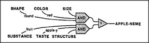 Let's pursue this example and imagine that those words have caused three partial states to become active among your agencies. Your Taste agency is in the condition corresponding to apple taste, your Physical Structure agency is representing thin-peeled, and your Substance agency is in the state that corresponds to fruit. Thus, even though there is no apple in sight, this combination would probably activate one of your apple polynemes. Let's call them apple-nemes for short. How could we make a machine do that? We would simply attach another recognizer to the apple-neme, a recognizer whose inputs come from memories instead of from the sensory world.