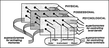 This suggests that certain pronomes can operate in several different realms at once. Let's call them paranomes to emphasize their parallel activities. When the language-agency activates some polynemes and paranomes, these agents run crosswise through the agencies of various realms to arouse several processes and frames at the same time; these correspond to different interpretations, in different realms, of the same phrase or sentence. Then, because each major agency contains its own memory-control system, the agencies within each realm can simultaneously apply their own methods for dealing with the corresponding aspect of the common topic of concern. In this way, a single language-phrase can at the same time evoke different processes involved with social dispositions, spatial images, poetical fancies, musical themes, mathematical structures — or any other assortment of types of thought that don't interfere too much with one another.