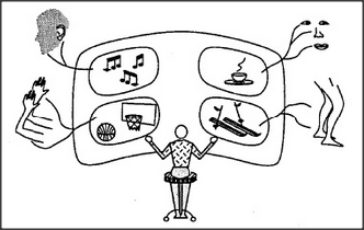 This diagram depicts our sensory machinery as sending information to the brain, wherein it is projected on some inner mental movie screen. Then, inside that ghostly theater, a lurking Self observes the scene and then considers what to do. Finally, that Self may act — somehow reversing all those steps — to influence the real world by sending various signals back through yet another family of remote-control accessories.