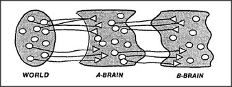 There is one way for a mind to watch itself and still keep track of what's happening. Divide the brain into two parts, A and B. Connect the A-brain's inputs and outputs to the real world — so it can sense what happens there. But don't connect the B-brain to the outer world at all; instead, connect it so that the A-brain is the B-brain's world!