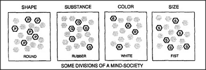We make our new ideas by merging parts of older ones — and that means keeping more than one idea in mind at once. Let's oversimplify matters for the moment and imagine that the mind is composed of many divisions, each involved with a different activity, like vision, locomotion, language, and so forth. This pattern repeats on smaller scales, so that even the thought of the simplest ordinary object is made up of smaller thoughts in smaller agencies. Thinking about a small white rubber ball could activate some divisions like these: