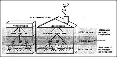 We sometimes think of memory as though it could transport us back to hear the voices of times gone by and see the sights of the past. But memory can't really take us anywhere; it can only recall our minds to prior states, to visit what we used to be, by putting back what was in the mind before. We introduced the level-band theory to provide a way for a memory to encompass some range or level of detail of descriptions, as when, in remembering that kite experience, certain aspects were recorded firmly and others weakly or not at all. The concept of a level-band can be applied not only to descriptions of things, but also to our memories of the processes and activities we use in order to achieve our goals — that is, the mental states we re-create that once solved problems in the past. The problems we have to solve change with time, so we must adapt our old memories to our present goals. To see how level-bands can help with that, let's now return to Play-with-Blocks — but this time let's suppose that our child has grown to maturity and wants to build a real house. Which agents from the old building-society can still be applied to this new problem?