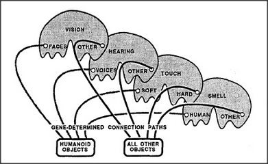 The large-scale outline of this agency poses no engineering mystery — but we have to ask how genes could produce the sensory detectors that the system needs to do its job. There is ample evidence that the recognition of both voices and faces does indeed take place in special sections of the brain — since certain injuries of the brain leave their victims unable to distinguish voice sounds yet still able to recognize many other kinds of sounds, while other brain injuries destroy the ability to recognize faces but leave other visual functions intact. No one yet knows just how these recognition-systems work, but let's consider each in turn.