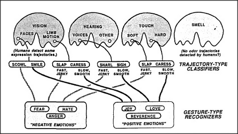 To recognize a voice or face seems hard enough; how does a child learn to recognize another person's mental state — of being angry or affectionate, for example. One way is by distinguishing trajectories. Just as we learn to interpret certain types of changes as representing the motions of objects in the physical realm, we learn to classify other types of changes as signifying mental events; these are what we call gestures and expressions. For example, to identify a certain sound to be a particular language-word, some agencies inside your brain must recognize that a certain sequence of phonetic features has occurred. At the same time, other agencies interpret sequences of vocal sounds as having significance in other realms. In particular, certain types of vocal sounds are recognized as signifying specific emotional qualities. For example, people almost universally agree on which expressions seem most angry or imperative. In general, abruptly changing sounds evoke alarm — perhaps by inducing the sort of narrowing of interest that comes with pain; in any case, sudden changes in volume and pitch demand that we attend to them. In contrast, we react to gentle sounds in ways that people label positive, as with affection, love, or reverence; the smoother time-trajectories do somehow serve to calm us down, thus frequently inducing us to set aside our other interests. It's quite the same for sight and touch; hostile persons tend to jab and shout, while friendly people speak and wave with gestures and trajectories that we perceive as signifying gentleness and tenderness. Indeed, as shown in Manfred Clynes's book, Sentics, Doubleday, New York, 1978, people show similar emotional responses to certain types of time-trajectories regardless of the sensory domain. We consistently identify certain sudden, jerky types of action patterns as indicating anger — regardless of whether these are presented as visual motions, as envelopes of voice sounds, or as pushing, shoving tactile stimuli. In the same way, we consistently identify certain other, smoother action patterns to indicate affection. Clynes concludes that at least half a dozen distinct types of trajectories are universally associated with particular emotional states. What sort of brain-machinery could cause us to react in such similar ways to such different kinds of stimuli? I propose a three-part hypothesis. First, each of our sensory-agencies is equipped with special agents that detect certain types of time-trajectories. Second, the outputs of all the agents that detect similar trajectory types in different agencies are connected, through special connection bundles, to converge upon agents in some central gesture-recognizing agency. Finally, genetically established nerve-bundles run from each gesture-recognizing agent to a particular infantile proto-specialist of the sort described in section 16. 3.