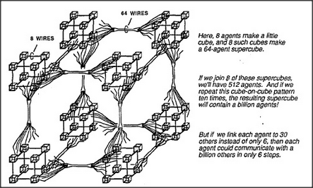 Let's return to the architecture of machines that could hold societies of mind. How complicated this must be depends in part upon how many agents must be active at each moment. We can clarify the problem by considering two extremes. If only a few agents need to work at any time, then even an ordinary, serial, one-step-at-a-time computer could support billions of such agents — because each agent could be represented by a separate computer program. Then the computer itself could be quite simple, provided it has access to enough memory to hold all those little programs. On the other hand, no such arrangement would suffice to simulate societies of mind in which each of billions of agents constantly interact with all the others, all at once, because that would need more wires than any animal could carry in its head. I suspect that the human brain works somewhere in between; we do indeed have billions of nerve cells working at the same time, but relatively few of them have any need to communicate with more than a small proportion of the rest; this is simply because most agents are too specialized to deal with many types of messages. Accordingly, we'll propose an architecture that lies between those serial and parallel extremes — namely, a compromise in which a typical agent has comparatively few direct connections to other agents but can still influence a great many other agents through several indirect steps. For example, we can imagine a society in which each of a billion agents is connected to thirty other agents, selected at random. Then most pairs of agents should be able to communicate through merely half a dozen intermediates! This is because a typical agent can reach thirty others in one step, a thousand others in two steps, and a million others in only four steps. Thus a typical agent could reach any of the other billion agents in only six or seven steps!