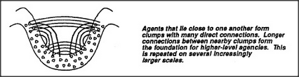 However, randomly selected connections would not be very useful, because very few randomly selected pairs of agents would have any messages that might be useful to one another. When we actually examine the human brain, we find that connections between cells are not made either uniformly or randomly. Instead, within any typical small region, we see a great many direct connections between nearby cells but only a relatively small number of bundles of connections to other regions of cells that lie farther away. Here is an idealized representation of this arrangement: