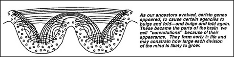 If the connections in the cortex of the brain develop this way, through sequences of cell migrations, it could provide each local neighborhood with potential access to several other areas, through fanlike bundles and arrays of nerves. I have the impression the human cortex becomes thus folded upon itself perhaps five or six times, so that agents in each neighborhood have potential access to several other levels of convolution. This makes it possible for a typical agent to become connected to millions of other agents through only a few indirect connections. Presumably, only a small minority of cells ever actually acquire many such connections for their own exclusive use; however, such an arrangement makes any particular group of cells potentially capable of acquiring more significance — for example, by gaining control of a substantial bundle of connections that comes to represent some useful microneme. In its evolutionary course of making available so many potential connections, the human brain has actually gone so far that the major portion of its substance is no longer in its agencies but constitutes the enormous bundles of nerve fibers that potentially connect those agencies. The brain of Homo sapiens is mainly composed of cabling.